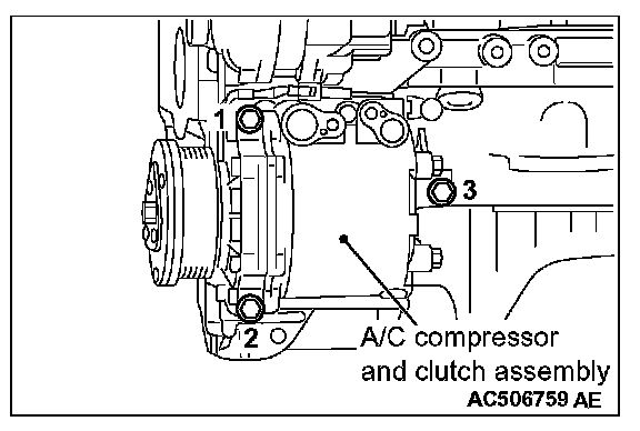 Tighten A/C compressor and clutch assembly mounting bolts to the specified torque in the order of number shown in the illustration.