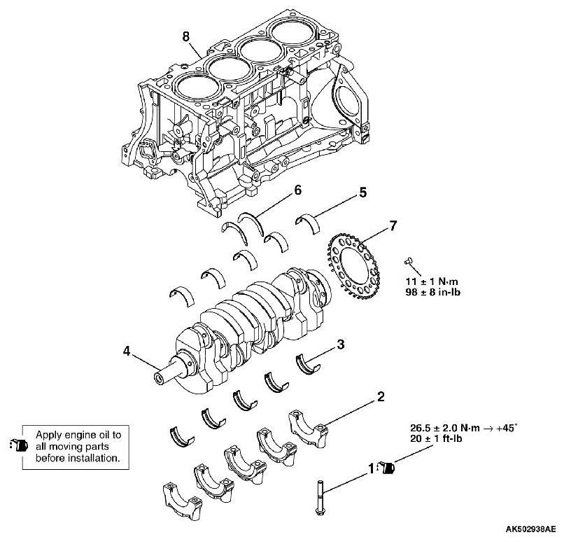 4. Tighten crankshaft bearing cap bolts to the torque of 26.5 ± 2.0 Nm (20 ± 1 ft-lb) according to the tightening order.