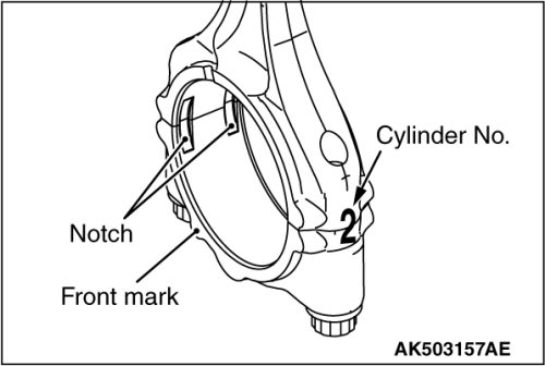 1. Assemble the bearing cap on the connecting rod by aligning it with the mark put during removal. If a new connecting rod without a mating mark is used, assemble so that the detent notch of the bearing is on the same side as illustrated.