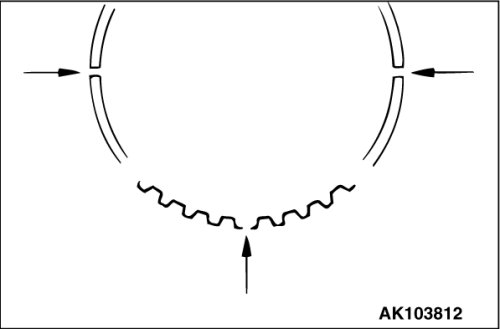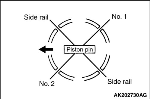 2. Arrange end gap positions of piston rings and oil ring (side rail and spacer) as shown in the illustration.