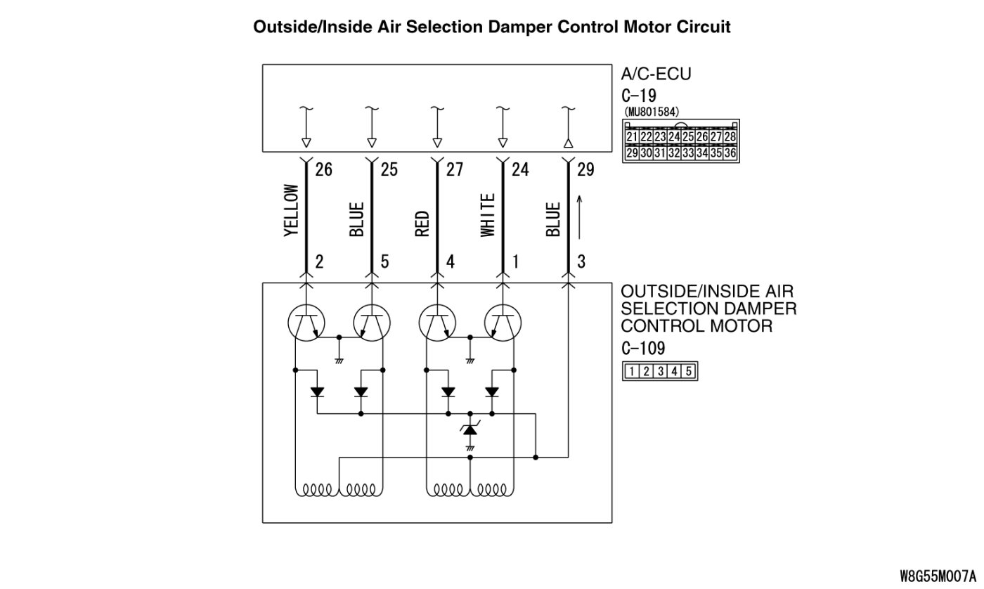 STEP 3. Check the wiring harness between A/C-ECU connector C-19 (terminals 26, 25, 27, 24 and 29) and outside/inside air selection damper control motor connector C-109 (terminals 2, 5, 4, 1 and 3).