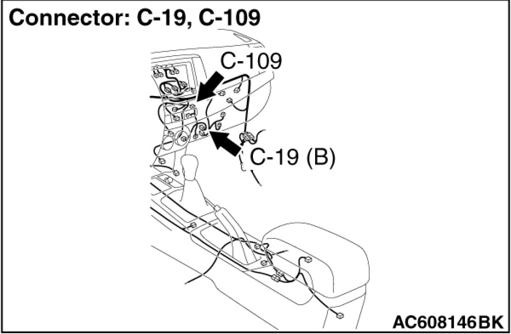 STEP 2. Check outside/inside air selection damper control motor connector C-109 and A/C-ECU connector C-19 for loose, corroded or damaged terminals, or terminals pushed back in the connector.