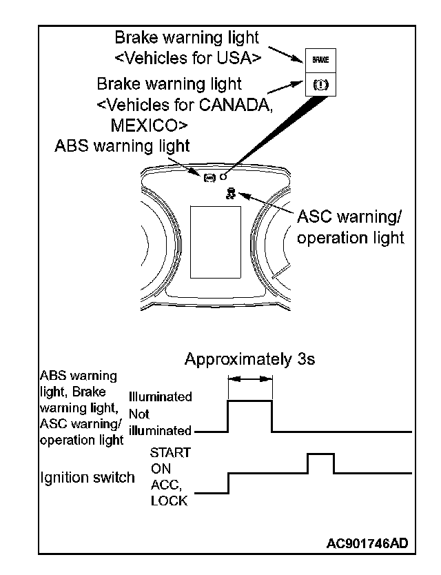 Check that ABS and brake warning light, ASC warning/operation light illuminate as follows.