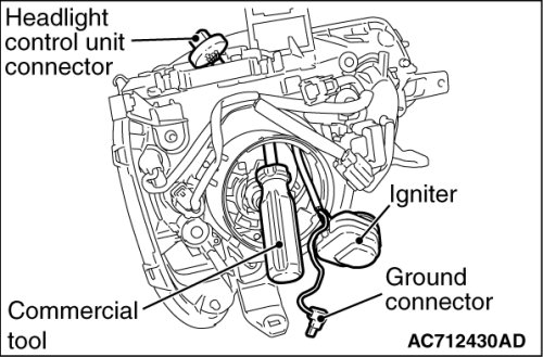 2. To insert the tool available in the market into the headlight assembly from the opening at the ignitor side, firstly remove the headlight control unit, the socket cover, the ignitor and the earth connector.