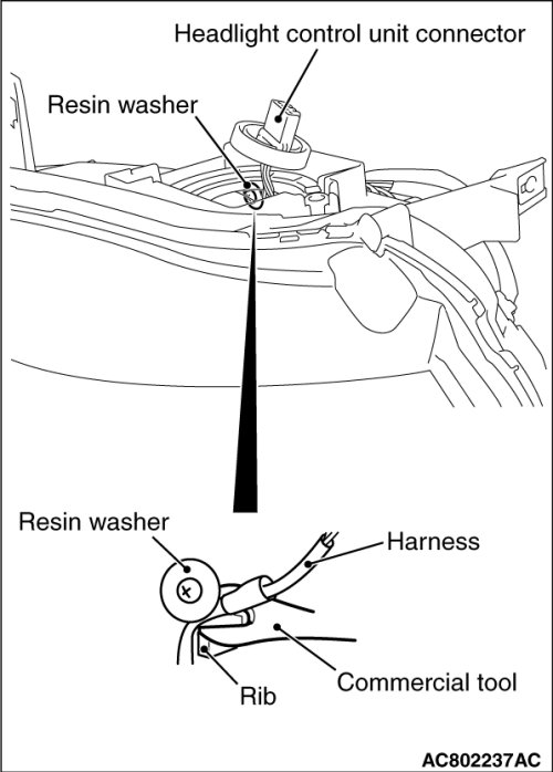 2. Install the harness to the headlight assembly. At that time, fitting the harness into the resin washer is unnecessary.