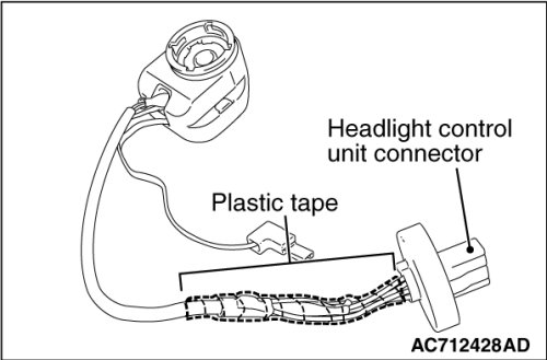 1. As shown in the figure, doubly wrap the portion in the vinyl tape, from the headlight control unit connector root to the point where the harness separation is hidden.
