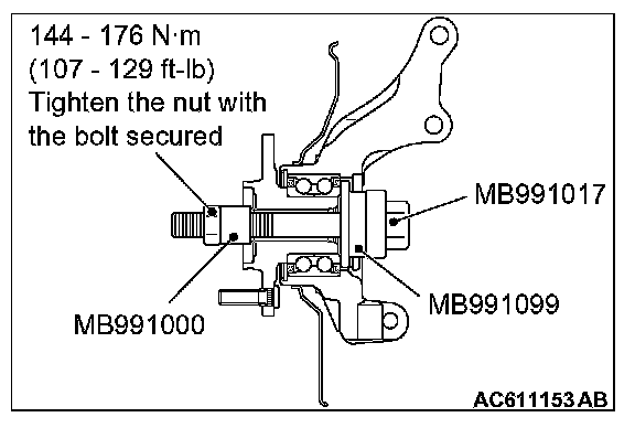 1. Set special tools MB991000, MB991017 and MB991099 as shown in the figure, tighten the nut to the specified torque, and press-fit the hub into the knuckle.