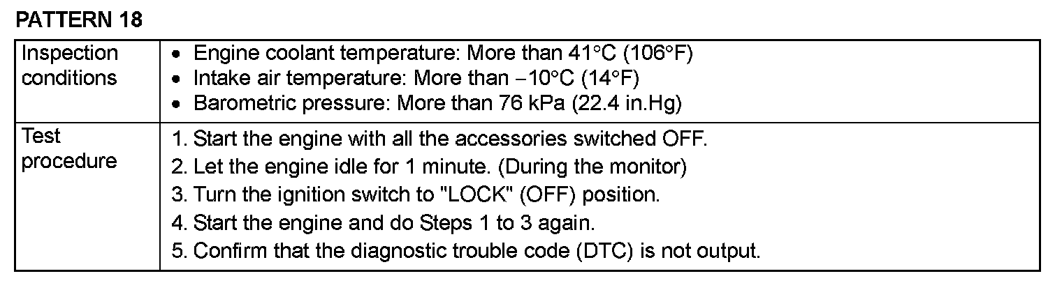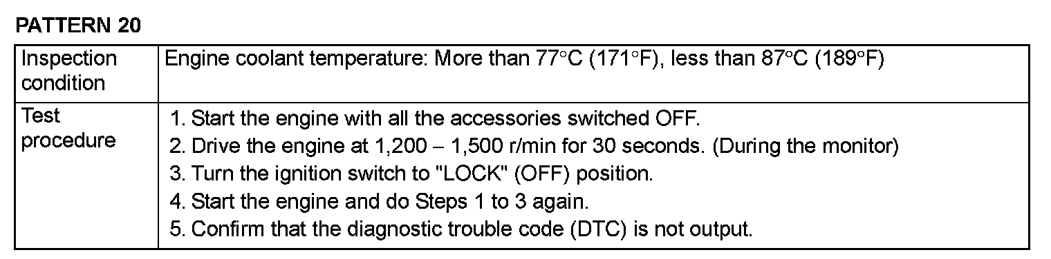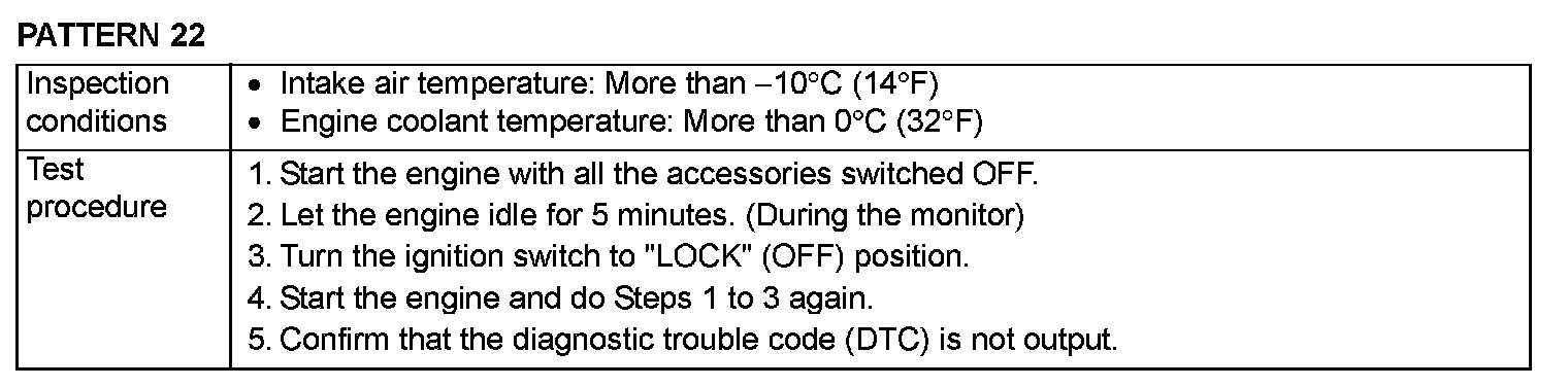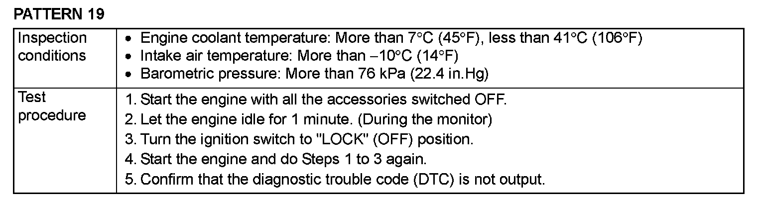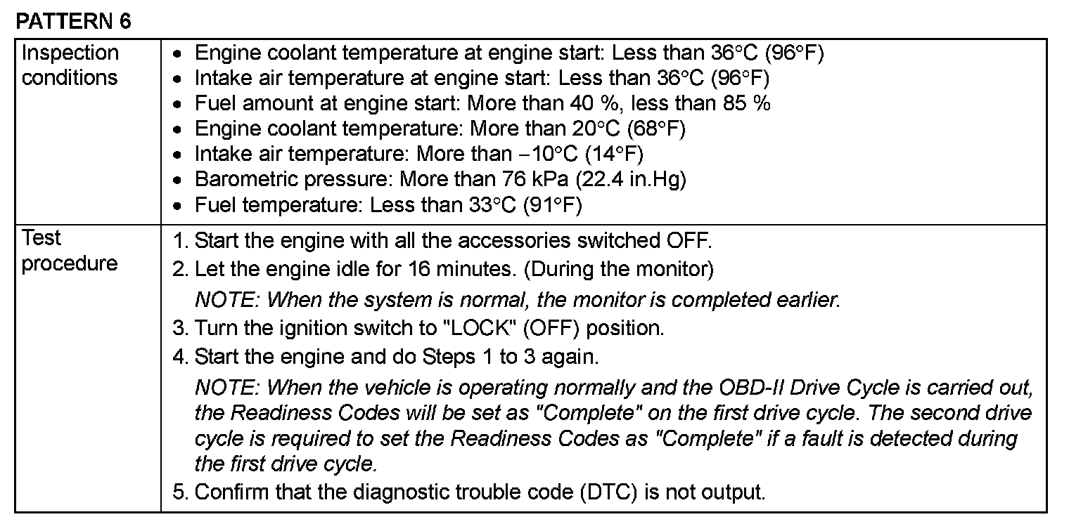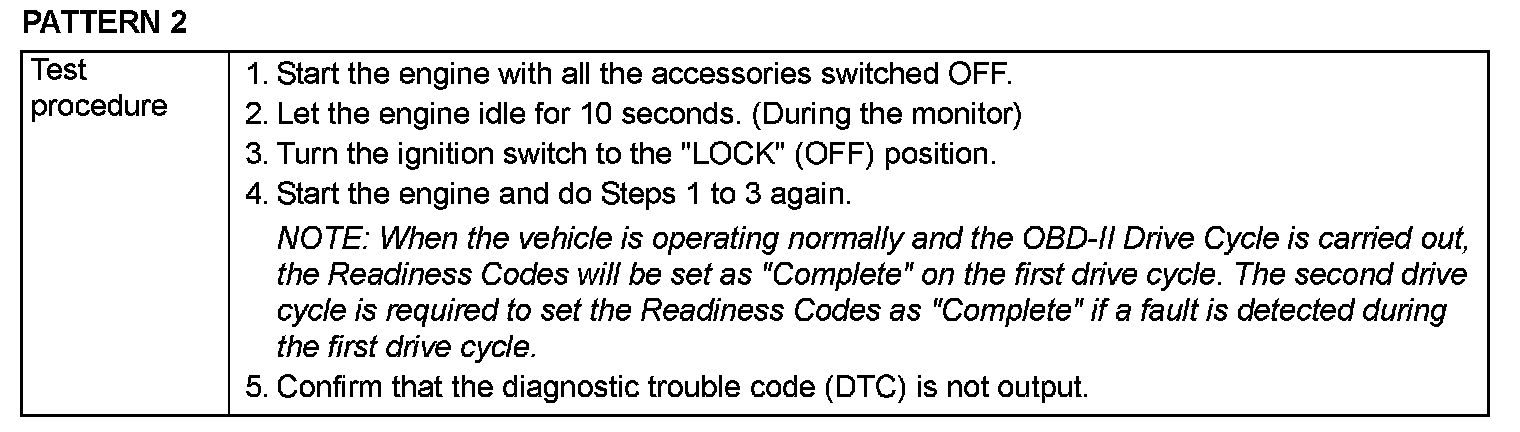 OBD- II DRIVE CYCLEAll kinds of diagnostic trouble codes (DTCs) can be monitored by carrying out a short drive according to the following 23 drive cycle patterns. In other words, doing such a drive regenerates any kind of trouble which involves illuminating the Malfunction Indicator Lamp (SERVICE ENGINE SOON or Check Engine Lamp) and verifies the repair procedure has been eliminated [the trouble the Malfunction Indicator Lamp (SERVICE ENGINE SOON or Check Engine Lamp) is no longer illuminated].