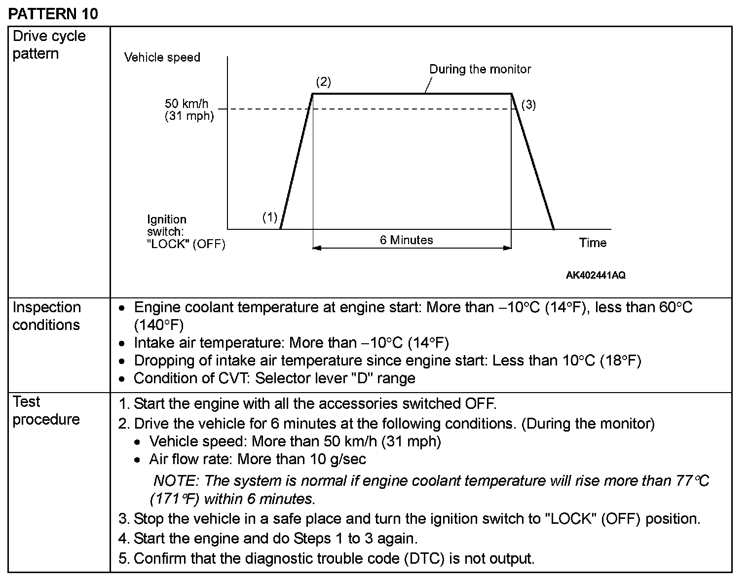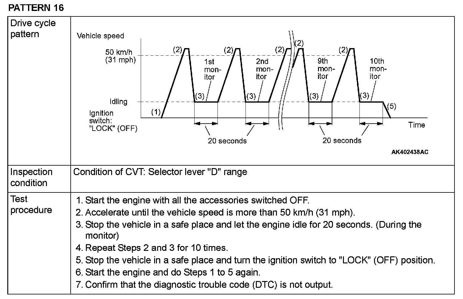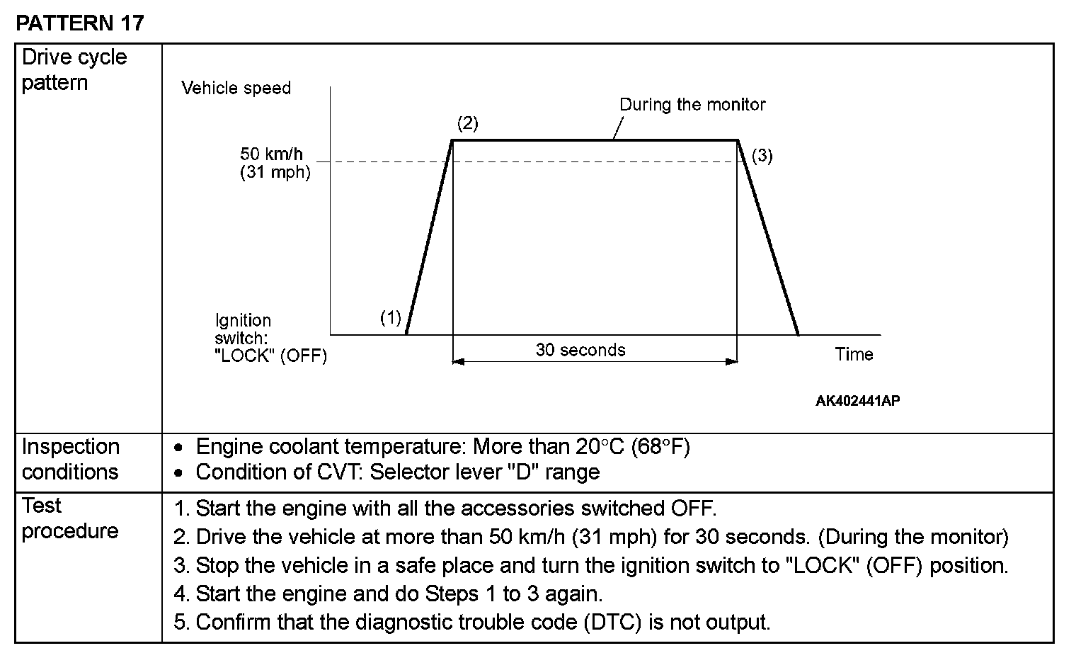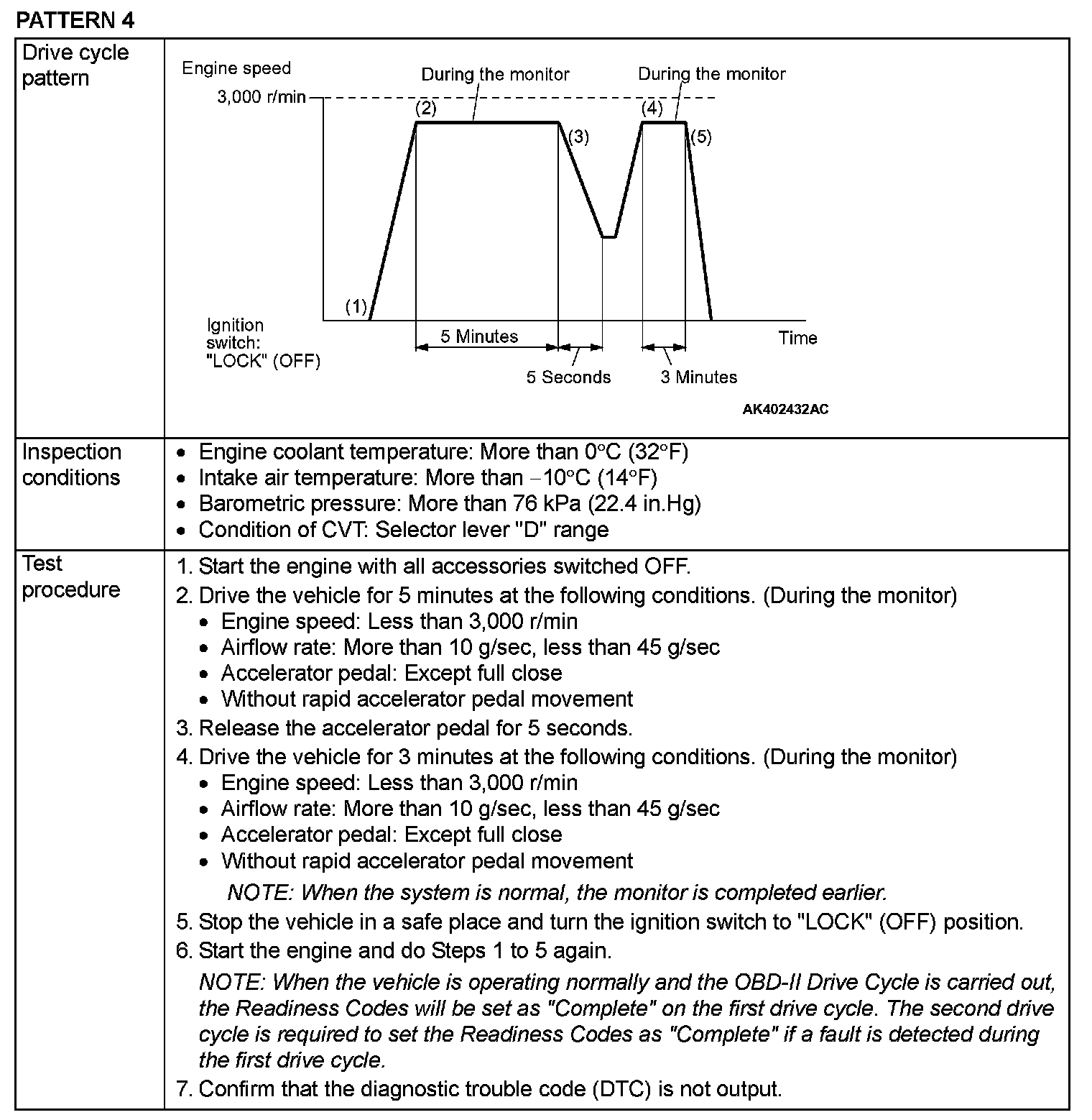 OBD- II DRIVE CYCLEAll kinds of diagnostic trouble codes (DTCs) can be monitored by carrying out a short drive according to the following 23 drive cycle patterns. In other words, doing such a drive regenerates any kind of trouble which involves illuminating the Malfunction Indicator Lamp (SERVICE ENGINE SOON or Check Engine Lamp) and verifies the repair procedure has been eliminated [the trouble the Malfunction Indicator Lamp (SERVICE ENGINE SOON or Check Engine Lamp) is no longer illuminated].
