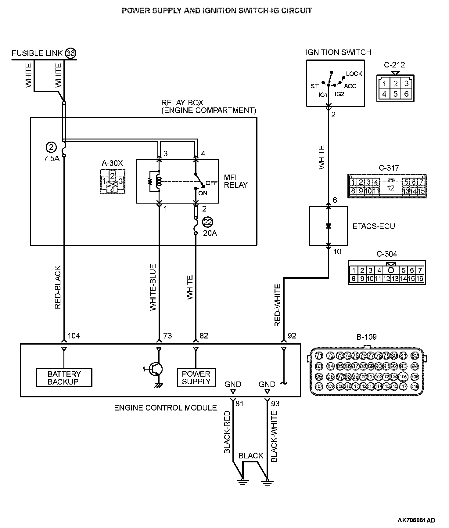 - When the ignition switch is turned to the "ON" position, battery positive voltage is applied to the ECM (terminal No. 92). When battery positive voltage is applied, the ECM turns the power transistor in the ECM "ON" and grounds the MFI relay coil. With this, the MFI relay turns "ON" the battery positive voltage is supplied to the ECM (terminals No. 82) from the MFI relay (terminal No. 2).