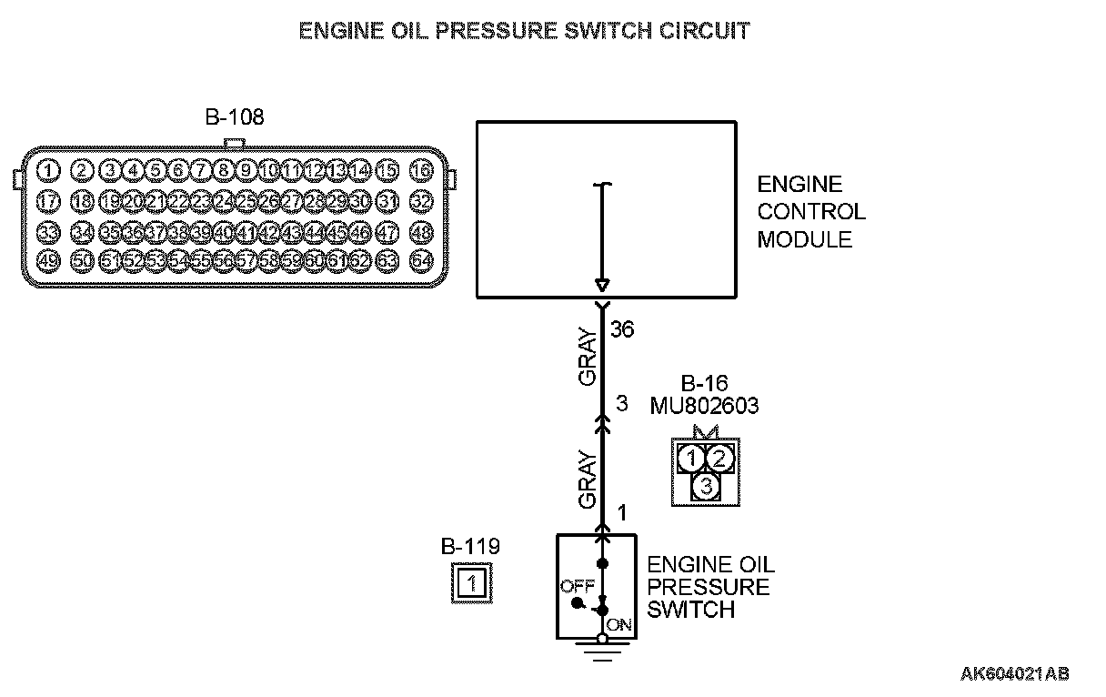 - Battery voltage is applied to the engine oil pressure switch (terminal No. 1) from the ECM (terminal No. 36).