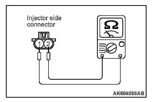 2. Measure the resistance between each injector side connector terminal No. 1 and No. 2.