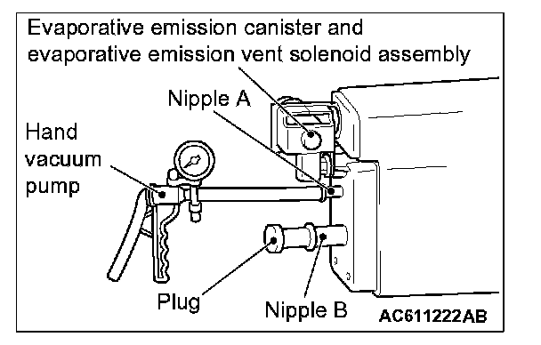 1. Connect a hand vacuum pump to nipple (A) of the evaporative emission canister and evaporative emission ventilation solenoid assembly.