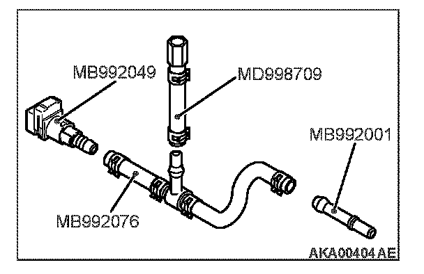 3. Assemble the special tool MB992076 (injector test set) as shown in figure according to the following procedure.