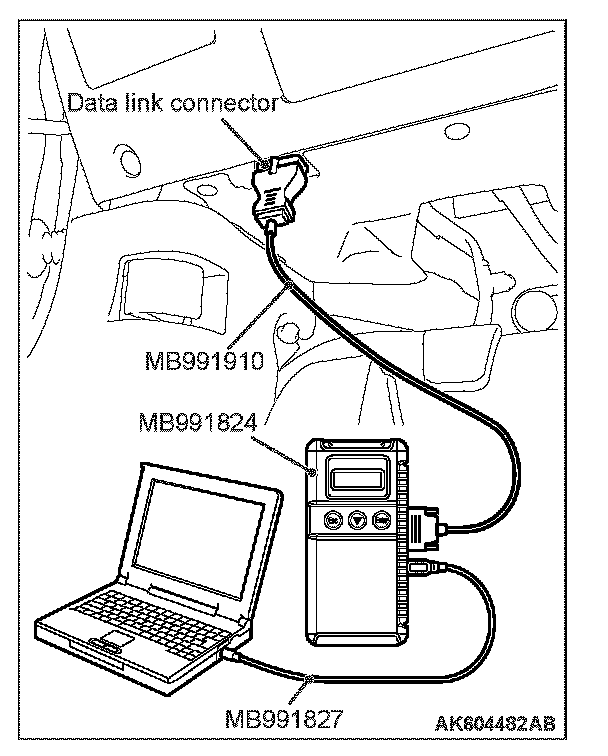 CAUTION: To prevent damage to scan tool MB991958, always turn the ignition switch to the "LOCK" (OFF) position before connecting or disconnecting scan tool MB991958.