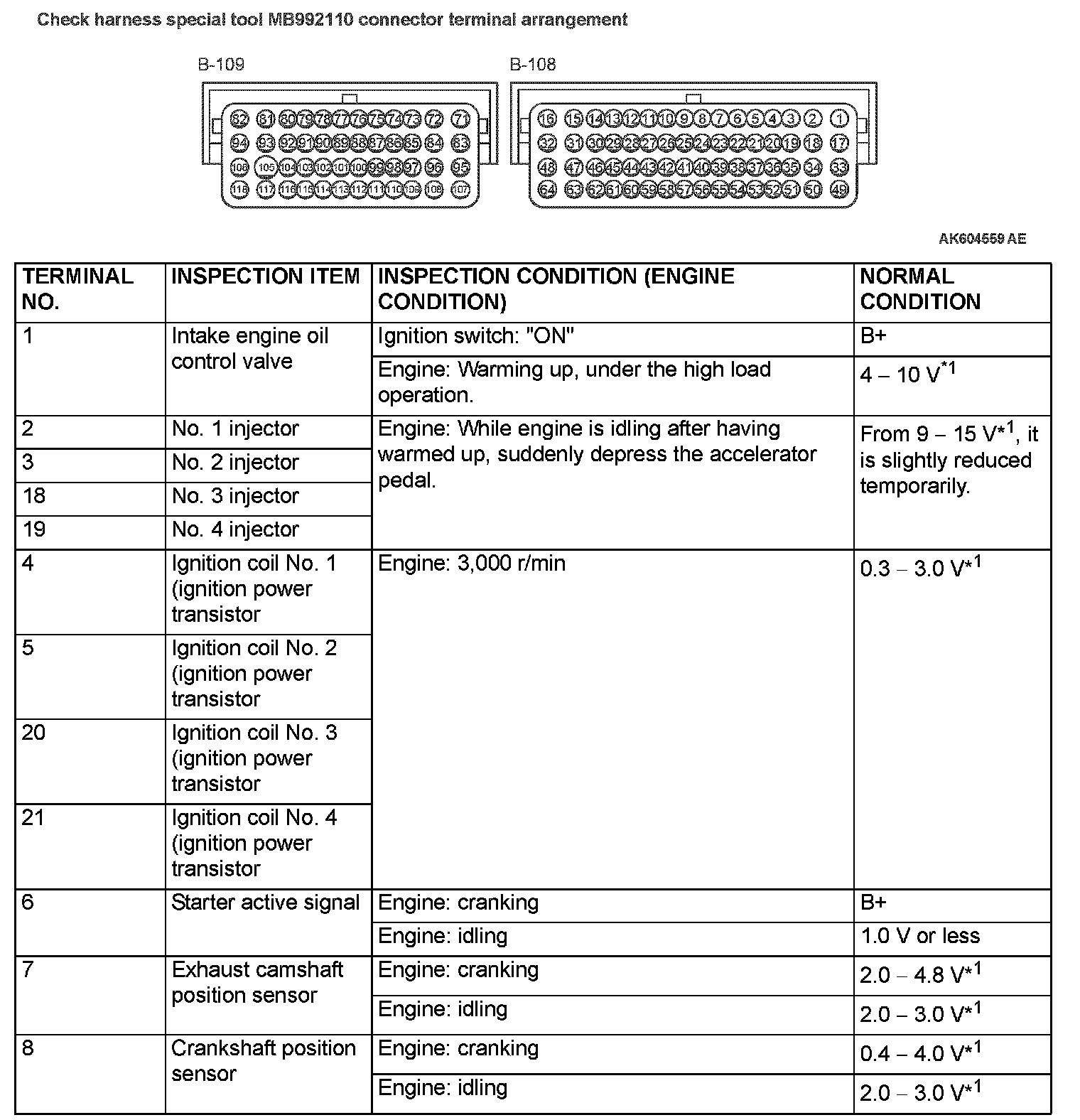 CHECK AT THE ENGINE CONTROL MODULE (ECM)1. Disconnect the ECM connectors B-108 and B-109, and connect check harness special tool MB992110 between the ECM connectors.