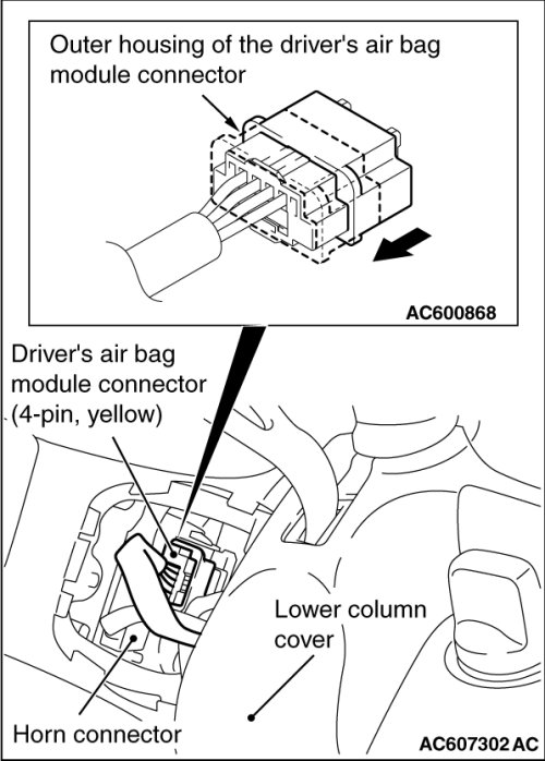 4. Slide the outer housing of the driver's air bag module connector in the arrow direction shown, and disconnect the connector.