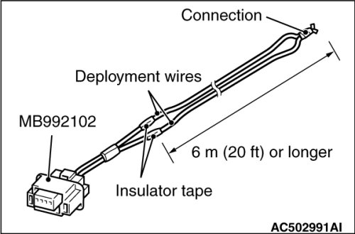 5. Connect deployment wires, each 6 meters (20 feet) or longer, to the two leads of special tool MB992102, and cover the connections with insulator tape. The other ends of the deployment wires should be connected to each other (short-circuited), to prevent sudden unexpected deployment of the air bag module.