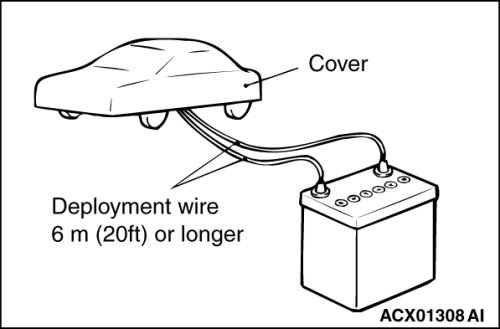 5. Connect deployment wires, each 6 meters (20 feet) or longer, to the two leads of special tool MB9921020, and cover the connections with insulator tape. The other ends of the deployment wires should be connected to each other (short-circuited), to prevent sudden unexpected deployment of the air bag module.