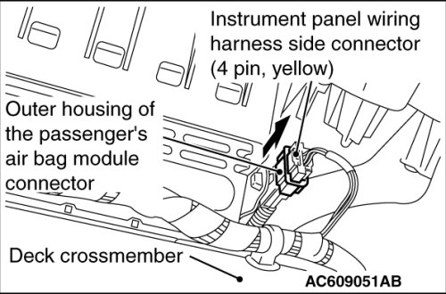 When the passenger's (front) air bag module connector is disconnected from the instrument panel wiring harness side connector, the four pins of inflator connector are automatically shorted.
