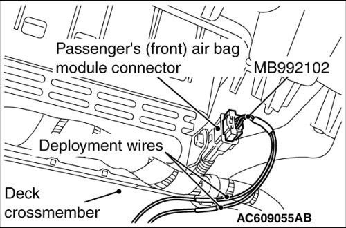 6. Connect the special tool MB992102 to the passenger's (front) air bag module, and then pull out the deployment wire to outside the vehicle.