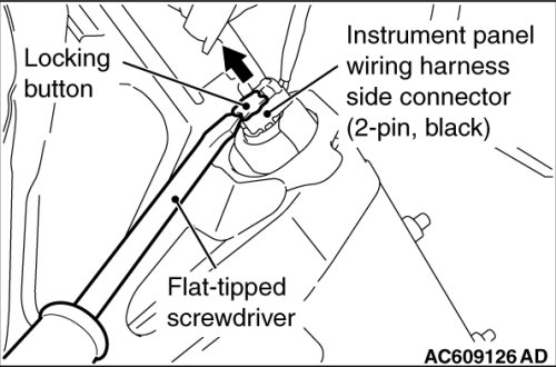 4. Use the flat-tipped screwdriver to pull out the locking button of knee air bag harness side connector. After releasing the lock, disconnect the connector.