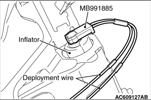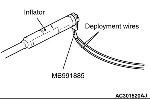 6. Connect the special tool MB991885 to the inflator, and then pull out the deployment wire to outside the vehicle.