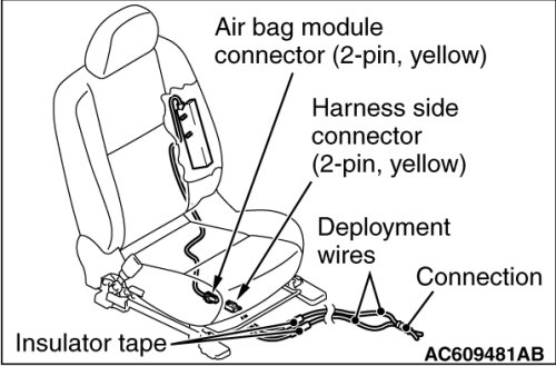 When the side-airbag module connector is disconnected from the floor wiring harness side connector, the two pins of side air bag module connector are automatically shorted. This prevents the unintentional deployment of side-airbags caused by the static or others.