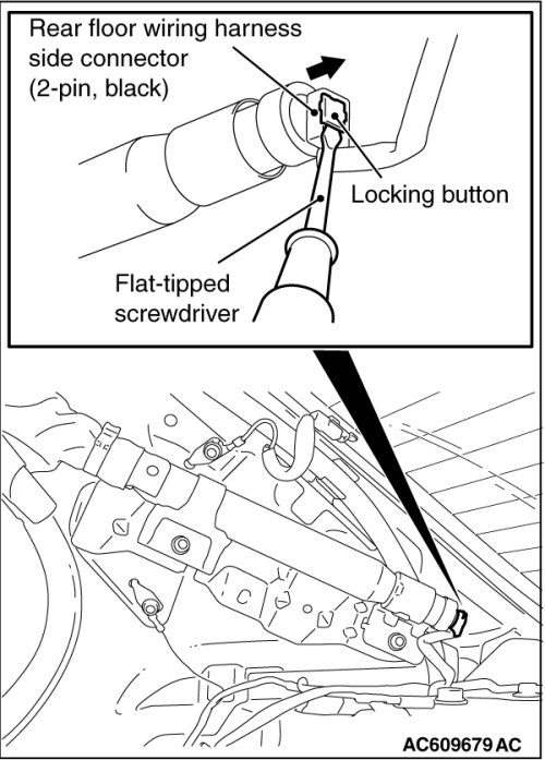 4. Use the flat-tipped screwdriver to pull out the locking button of rear floor harness side connector. After releasing the lock, disconnect the connector.