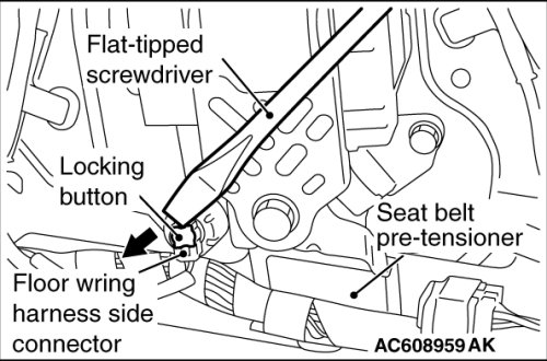 4. Use the slotted (-) screwdriver to pull out the locking button of floor harness side connector. After releasing the lock, disconnect the connector.