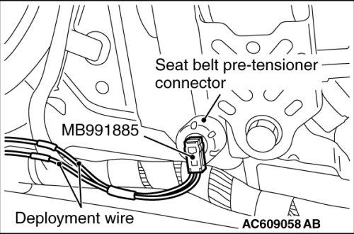 4. Connect the special tool MB991885, which the deployment wires is attached to, to the seat belt pre-tensioner connector.
