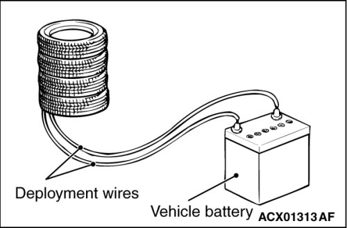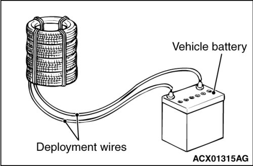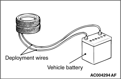 At a location as far away from the air bag module as possible, and from a shielded position, disconnect the two connected wires from each other, and connect them to the two terminals of the battery (which has been removed from the vehicle) to deploy the air bag.