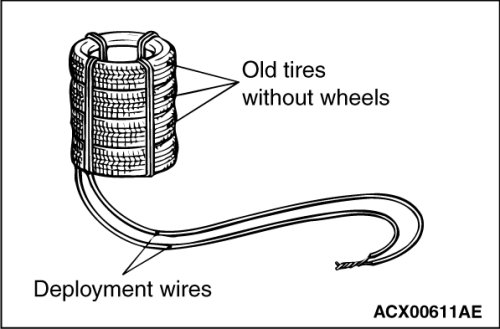 6. Place three old tires without wheels on top of the tire secured to the air bag module, and secure all tires together with ropes (four locations).