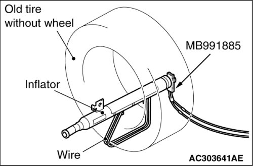 5. Pass the thick wire through the hole of air bag module mounting bracket. When, with the air bag module deployment surface facing upward, fit the module to the old tire with wheel.