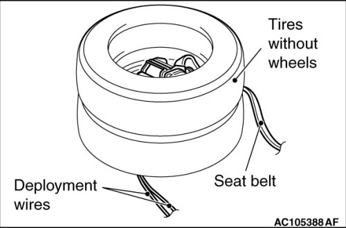 6. Place three old tires without wheels on the tire secured with the knee air bag module.