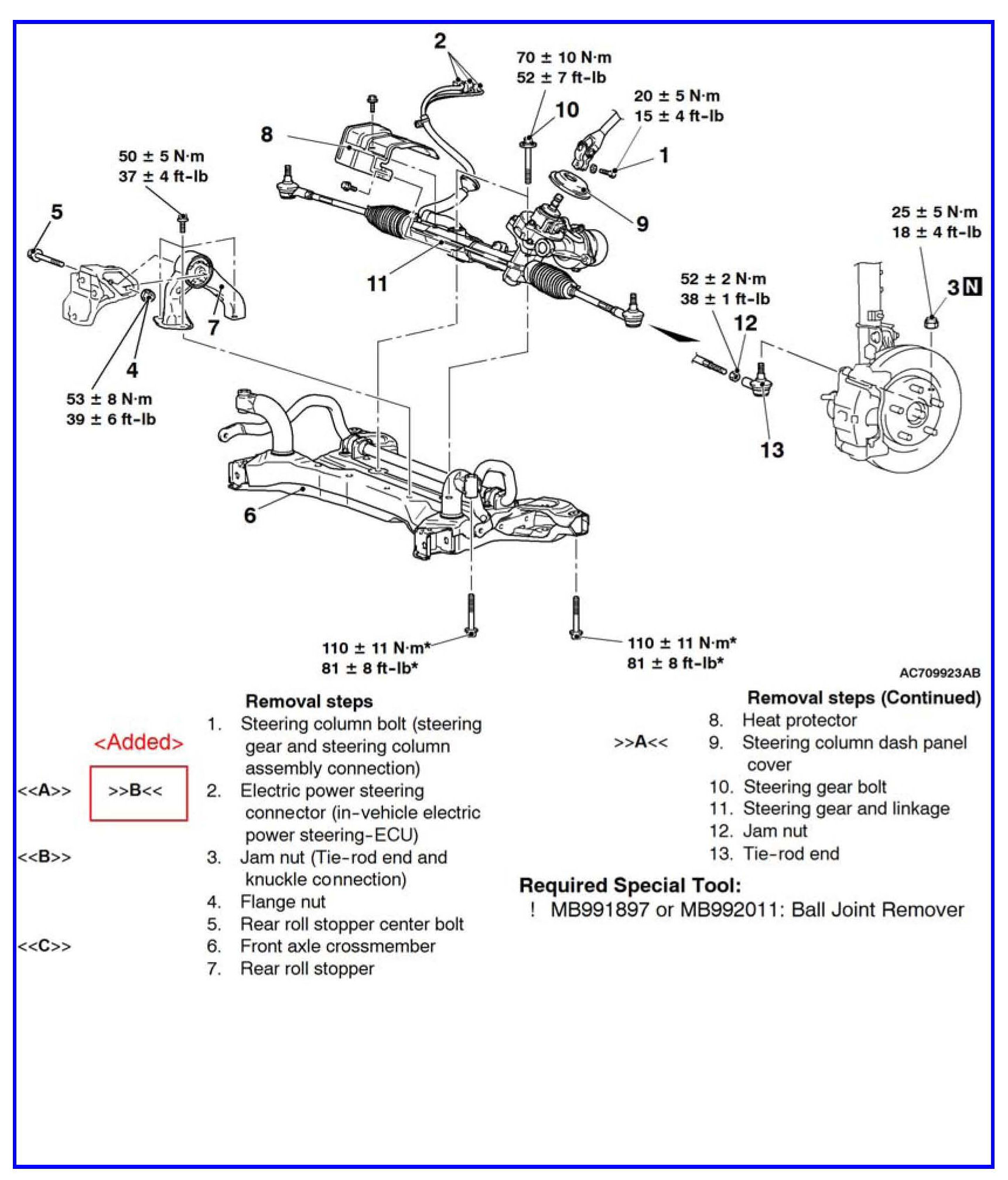 2011-2012 Lancer/Lancer Sportback Service Manual: Group 37B - Electric Power Steering (EPS) >> Power Steering Gearbox and Linkage >> Removal and Installation