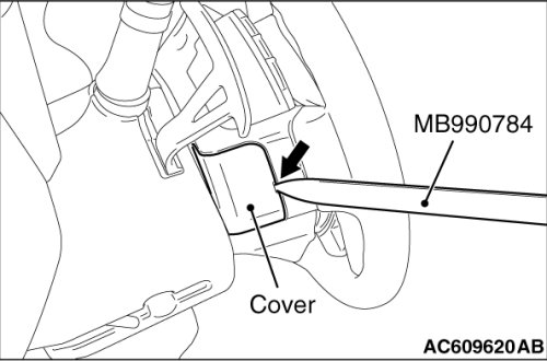 Insert the special tool MB990784 at the indicated position to remove the cover.