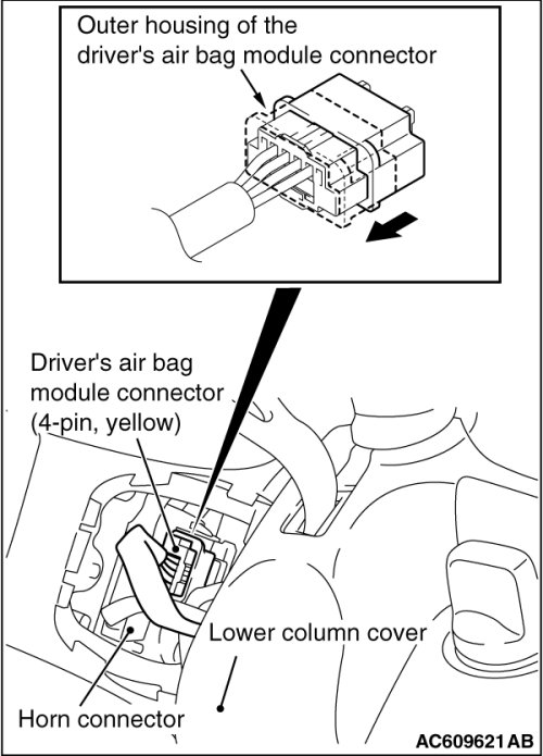 Slide the outer housing of the driver's air bag module connector in the arrow direction shown and disconnect the connector.