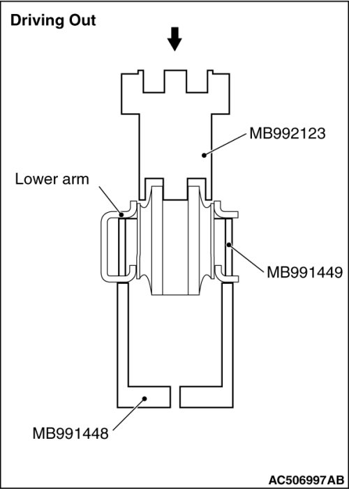 Use the special tools MB992123, MB991448 and MB991449 to remove and press-fit the lower arm bushing.