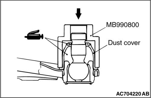 3. Use the special tool ball joint remover & installer (MB990800) to drive in the dust cover to the point where it contact with the lower arm assembly.