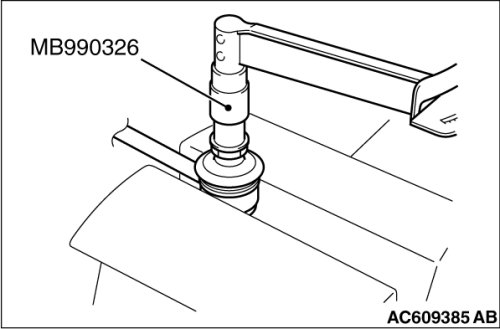 1. Move the stabilizer link ball joint stud back and forth for several times, install the stud with nut, and measure the stabilizer link ball joint rotation starting torque using special tool MB990326.