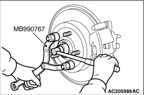 1. If the rear wheel hub assembly is seized with the rear driveshaft assembly, use special tools MB990242 and MB990244, MB991354 and MB990767 to push the rear driveshaft assembly out from the hub and then remove the rear wheel hub assembly. [AWD]