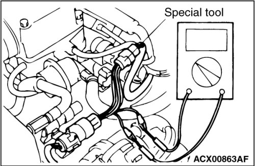 Inspect by inserting a test probe from the harness side. If the connector is too small to insert a test probe (e.g. control unit connector), do not insert it forcibly. Use special tool MB992006 (extra fine probe).