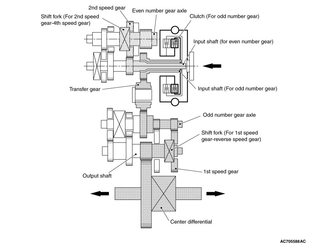 During driving with the 1st gear, the even number gear clutch is kept released, and the 2nd gear is engaged in advance. (During driving with even number gears, the odd number gears are engaged in advance.)