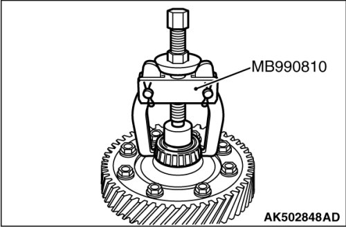 Using the special tools MB990810, remove the inner race of differential side bearing (converter housing side) from the differential sub-assembly.