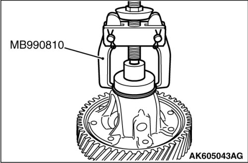 Using the special tool MB990810, remove the inner race of differential side bearing (transaxle case side) from the differential sub-assembly.