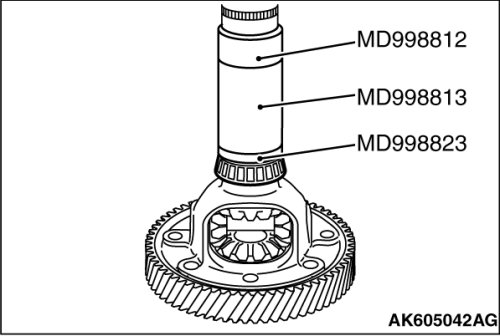 Using the special tools MD998812, MD998813 and MD998823, install the inner race of reduction gear bearing (transaxle case side) on the reduction gear sub-assembly.