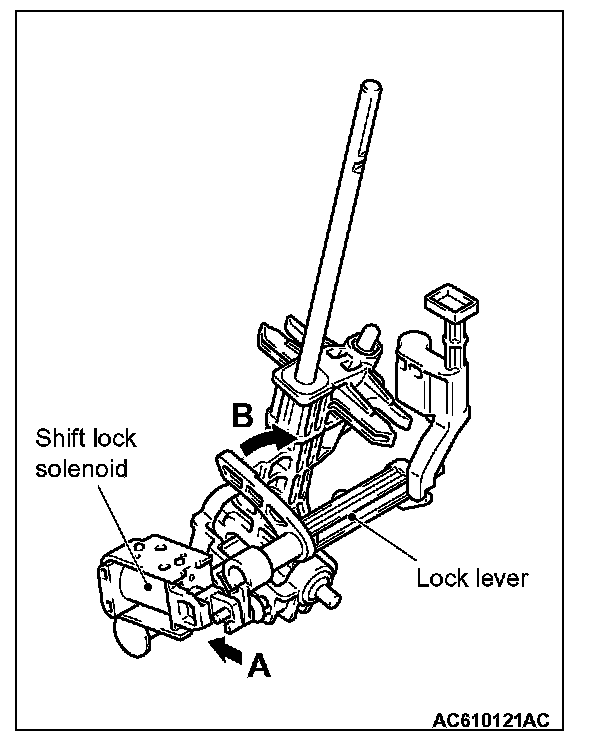 Check that the lock lever smoothly moves in the direction of arrow B in the figure when the shift lock solenoid plunger is pressed in the direction of arrow A, and smoothly moves back to the original position when the plunger is released.