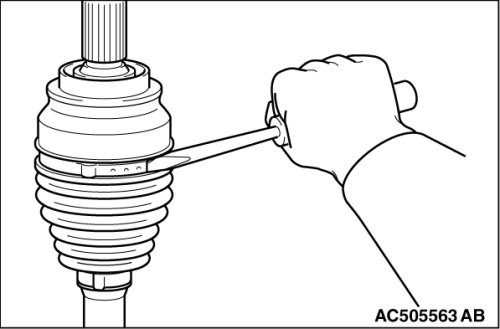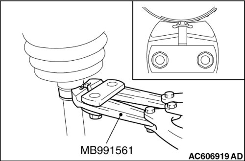 - Secure the driveshaft in an upright position and clamp part of the boot band to be crimped securely in the jaws of the special tool MB991561.