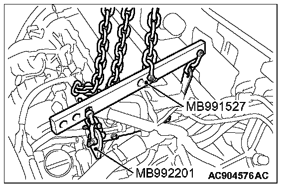 (3) Set the chains of engine hanger plate (special tool: MB991527) to support the engine and transaxle assembly. Remove the garage jack and then remove the transaxle assembly upper part coupling bolts that have been loosened previously.